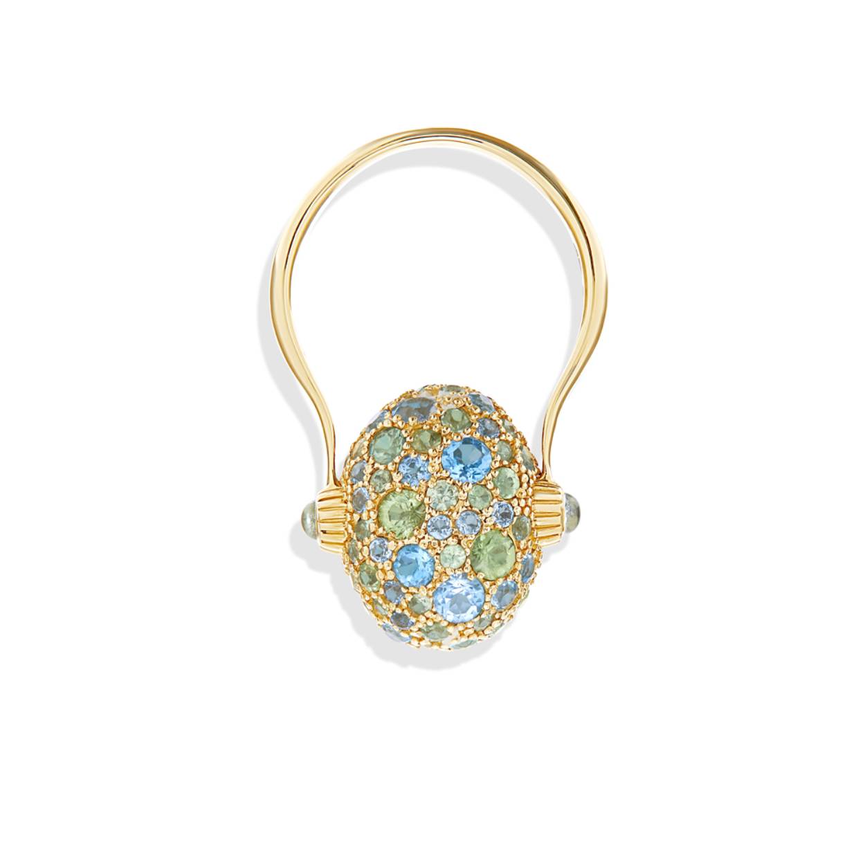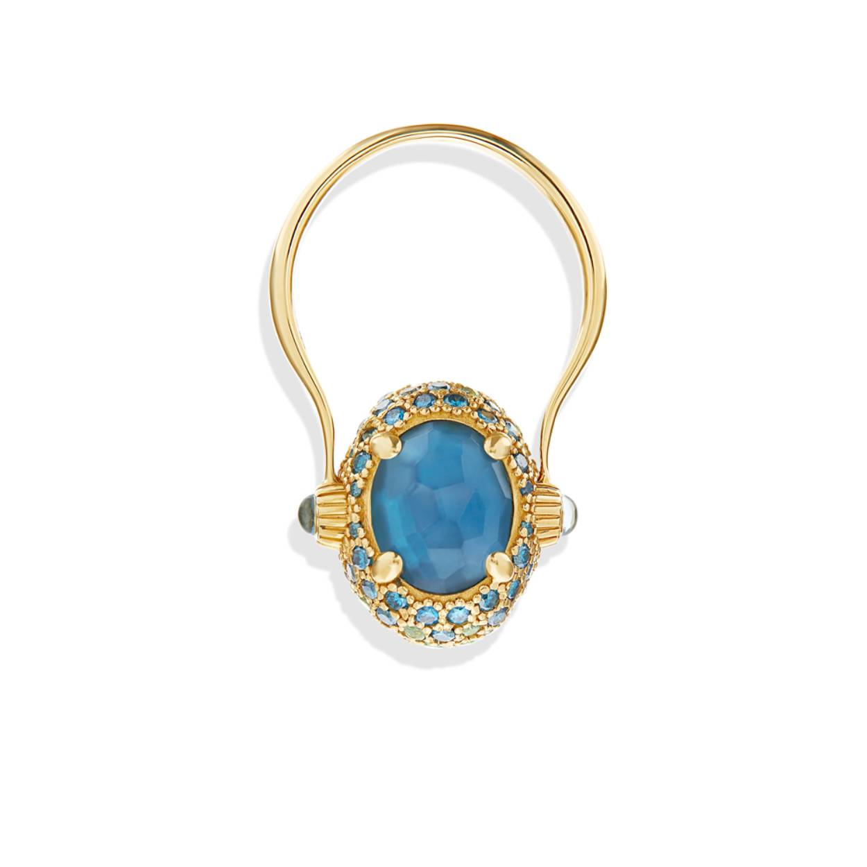 Met omgekeerde ringen combineert luxe de dynamiek van creativiteit, vindingrijkheid en verrassing: met een simpele draai laat deze 18-karaats gouden ring u zijn kostbare dubbelganger zien! De achterkant wisselt een doublet af met parelmoer en Londens blauwe topaas en een pavézetting van blauwe diamanten, groene saffieren en Zwitserse blauwe topaas. Een weelderig lichtspel dat u elke keer dat u hem draagt ​​zal verrassen.
