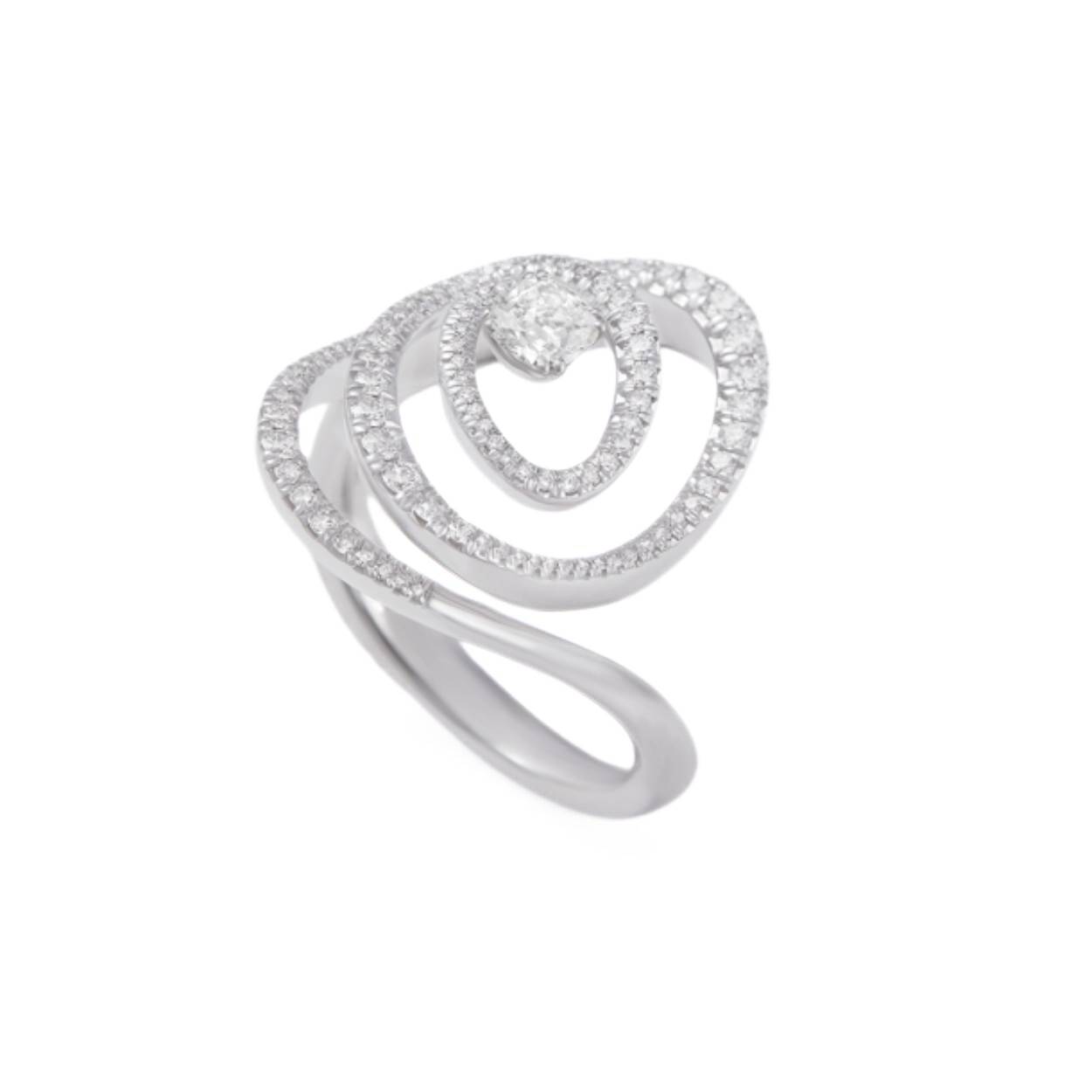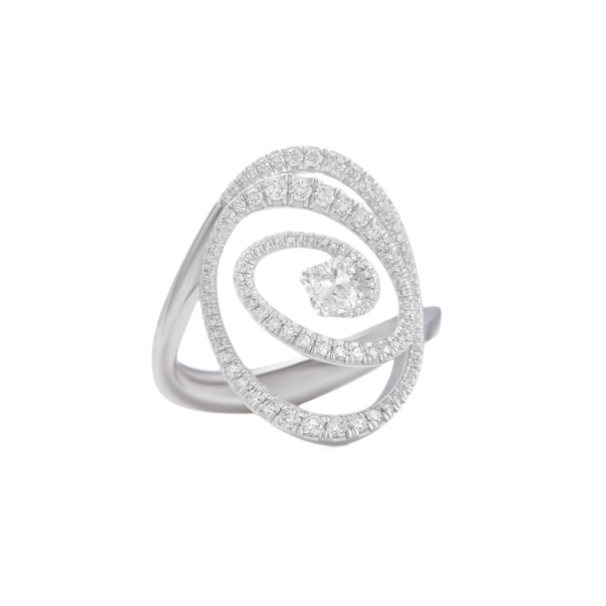 Witgouden ring , spiraalvorm met diamanten en centraal een vierkante diamant.