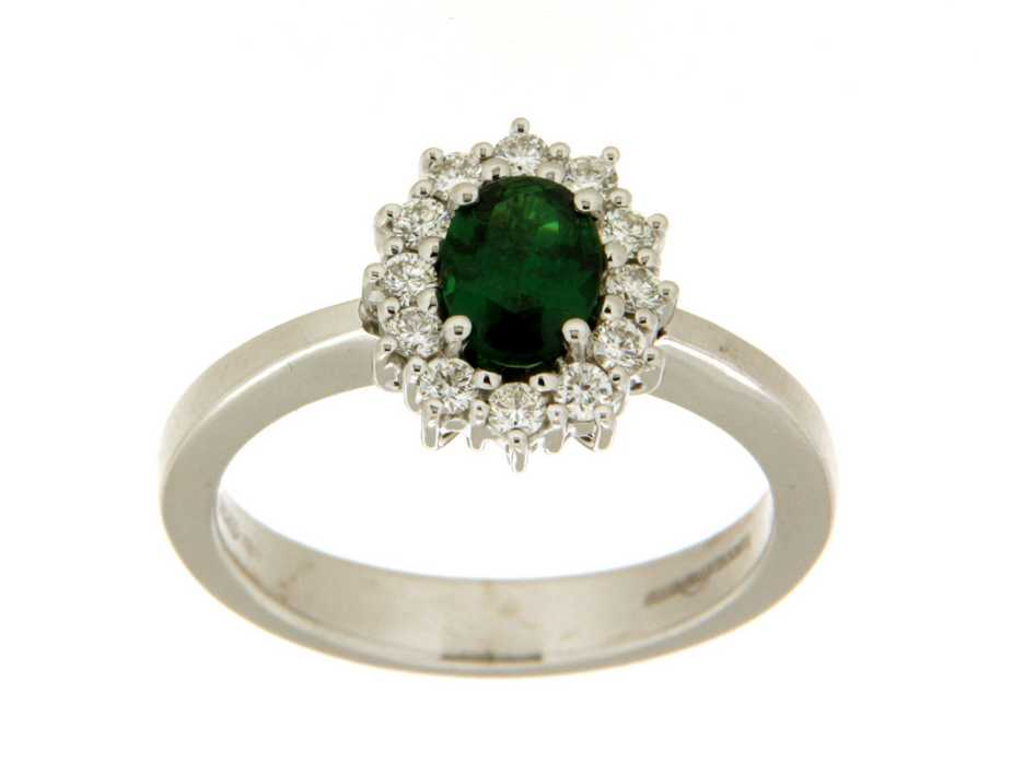Witgouden ring met Tsavoriet omringd door diamanten.