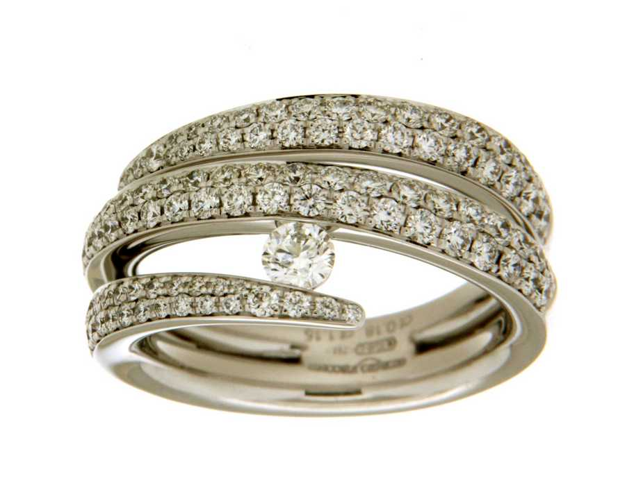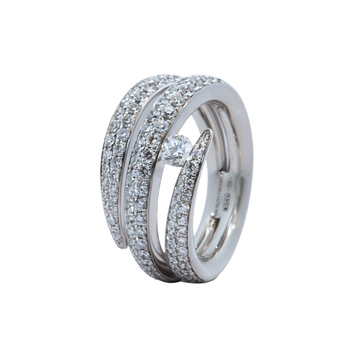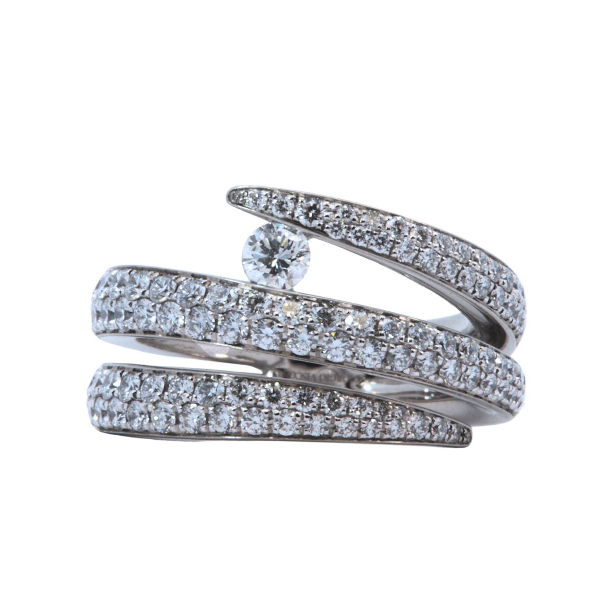 Witgouden ring in spiraalvorm met een centrale diamant van 0.18ct en zijdiamanten van 1.15ct
