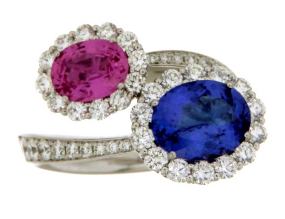 Witgouden ring met centraal een saffier en een tanzaniet van 1.35ct en rondom zijdiamanten van 1.56ct