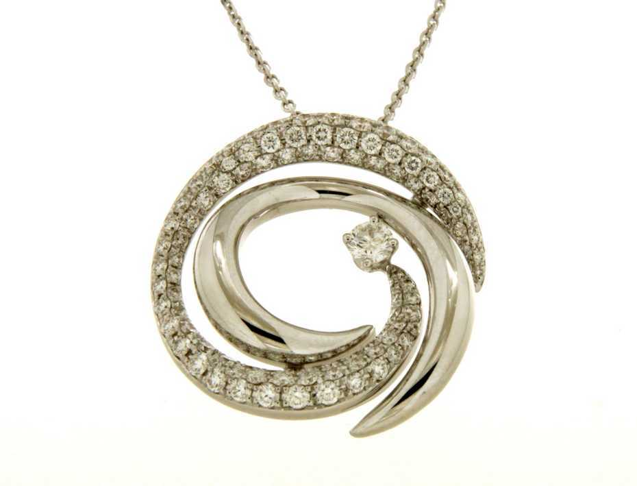 Witgouden ketting met een rond geometrisch design bezet met diamanten van 0.79ct en een centrale diamant van 0.12ct