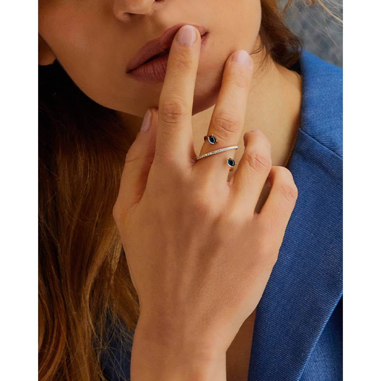 De Nanis Dancing Azure ring van Nanis is een verfijnd Italiaans sieraad met een moderne, elegante uitstraling. Centraal schittert een London blue topaas van 0,80 ct in een diepe, intens blauwe tint. Subtiele diamanten van samen 0,17 ct zorgen voor een sprankelend accent en versterken het luxe karakter. De ring is vervaardigd uit 3,4 gram goud en combineert vakmanschap met een eigentijds design. Een exclusief juweel dat perfect past bij vrouwen die houden van stijlvolle finesse met een krachtige kleurtoets.