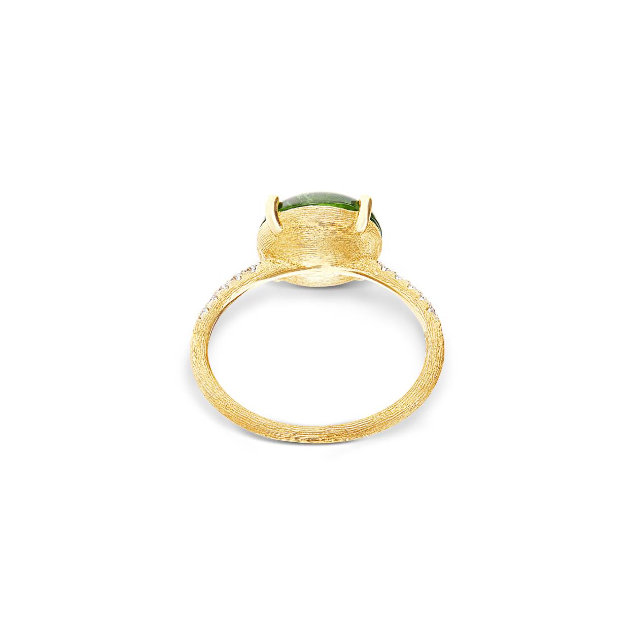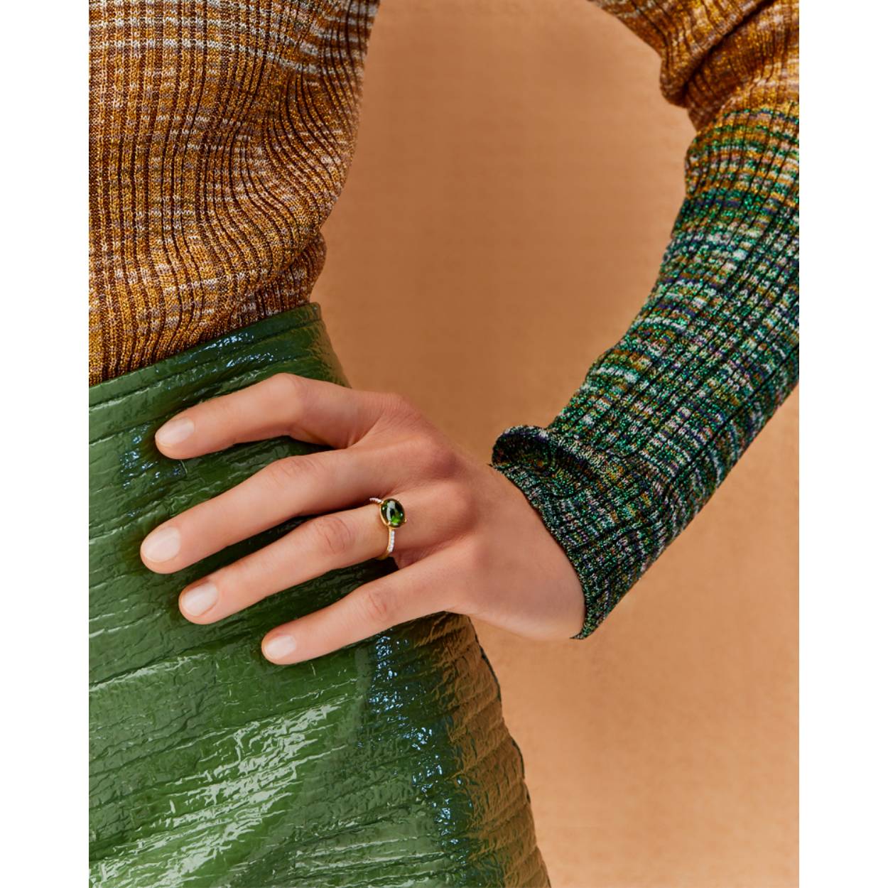 De groene toermalijn, een van de meest fascinerende stenen in de natuur, wordt in deze ring met minimalistische elegantie omarmd door diamanten en 18-karaats goud. Een vleugje kleur om aan je vinger te dragen!