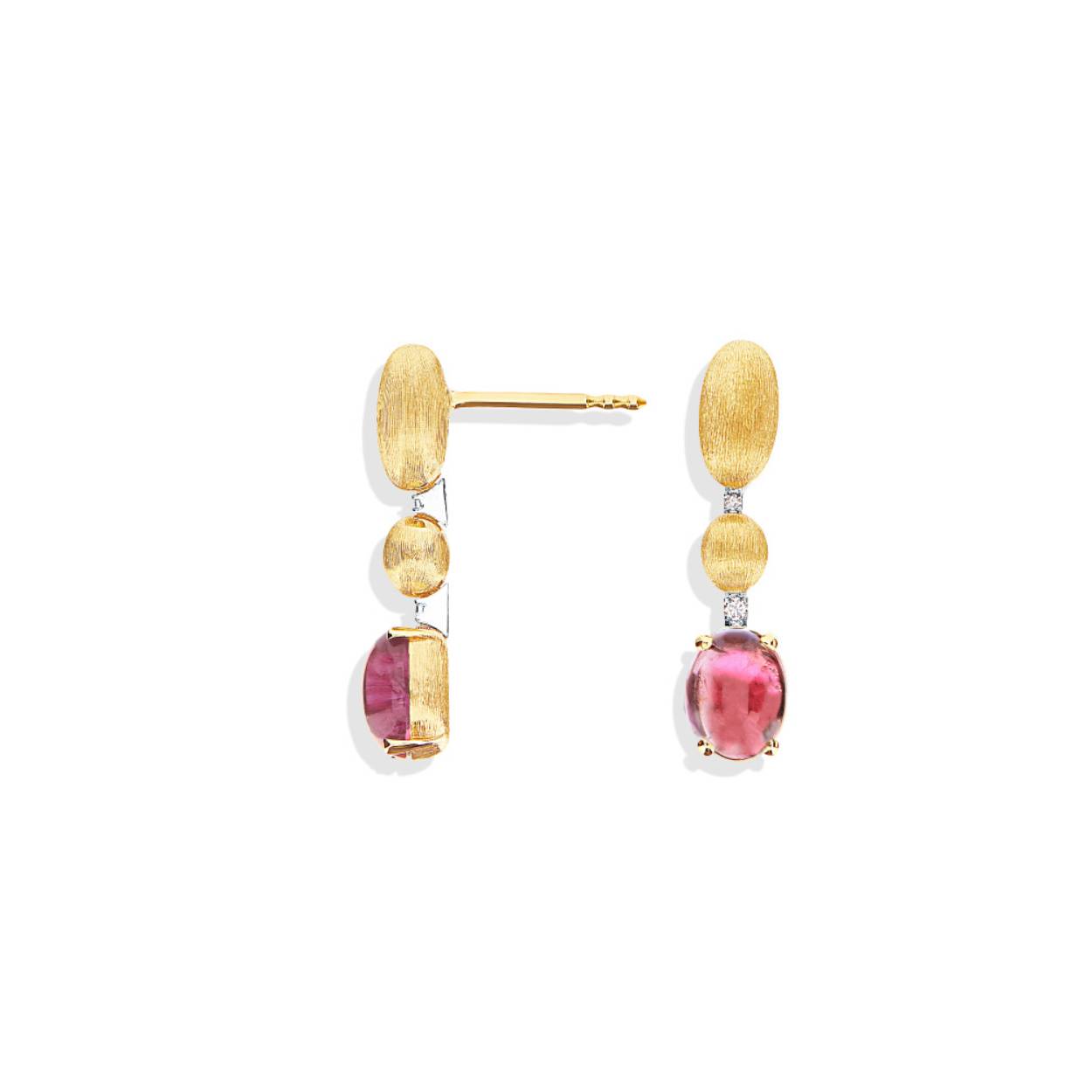 Twee boules van 18-karaats goud, met de hand gegraveerd met de eeuwenoude burijntechniek, lopen achter elkaar langs kleine riviertjes van diamanten tot ze verdwalen in de buitengewone tinten van de roze toermalijn boule. Een steen met een onbeschrijfelijke charme, uniek door zijn onregelmatige interne strepen, de signatuur van de grootste kunstenaar: de natuur.