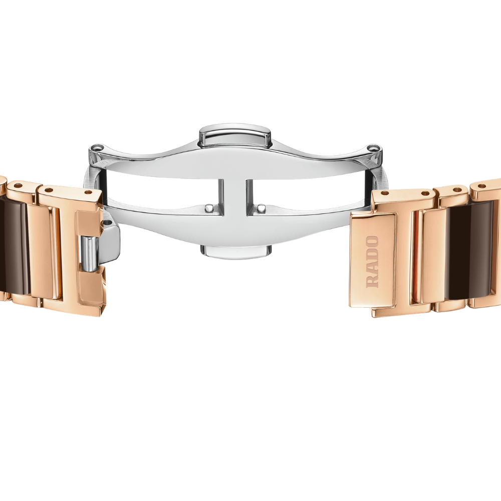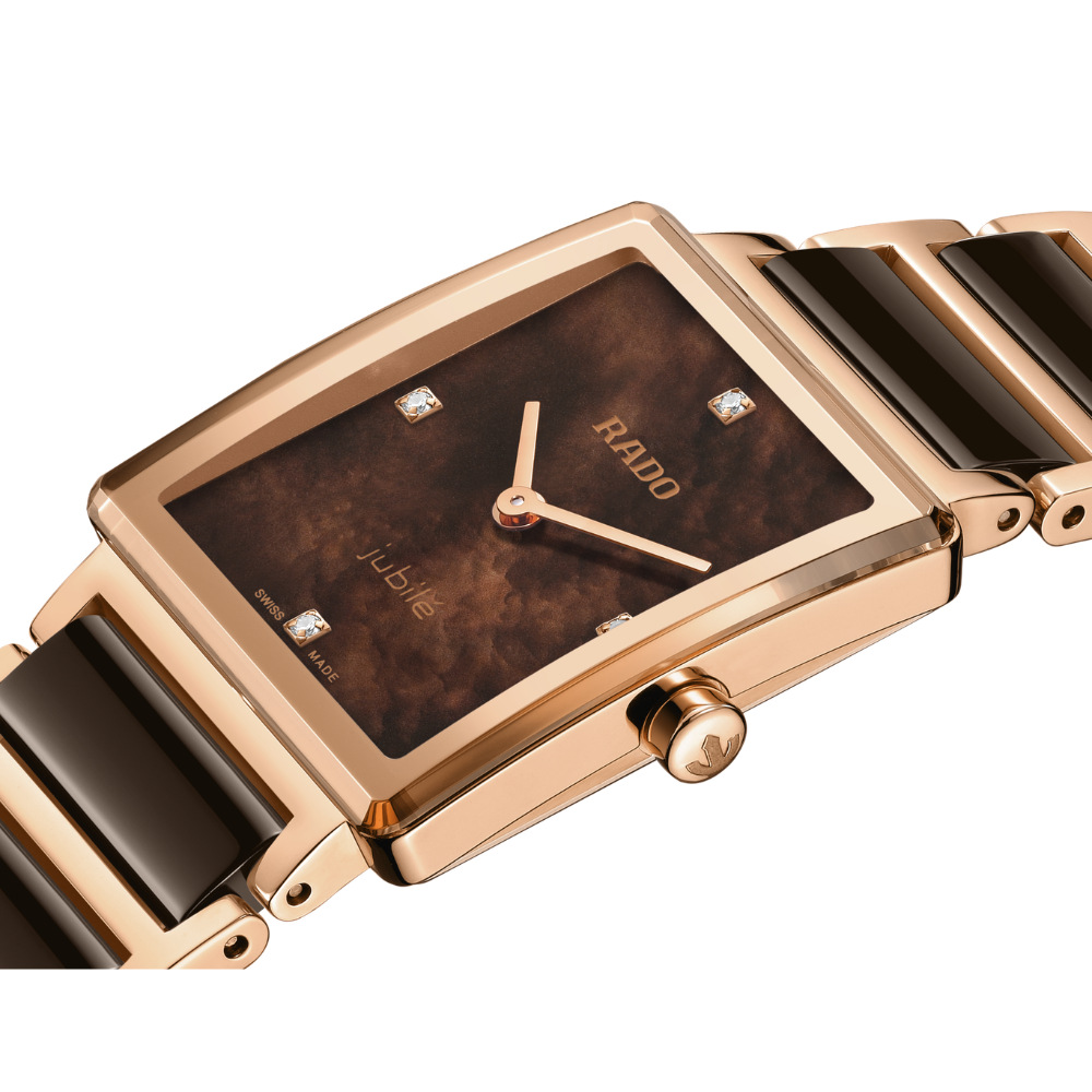 De Rado Integral Diamonds combineert een elegante uitstraling met hoogwaardige materialen. De horloge heeft een bruine parelmoer wijzerplaat met vier diamanten, een roségoudkleurige PVD-coating en high-tech keramische schakels. Het minimalistische design wordt aangedreven door een Zwitsers quartz uurwerk en beschermd door krasbestendig saffierglas. Een verfijnd en tijdloos model met optimaal draagcomfort.
