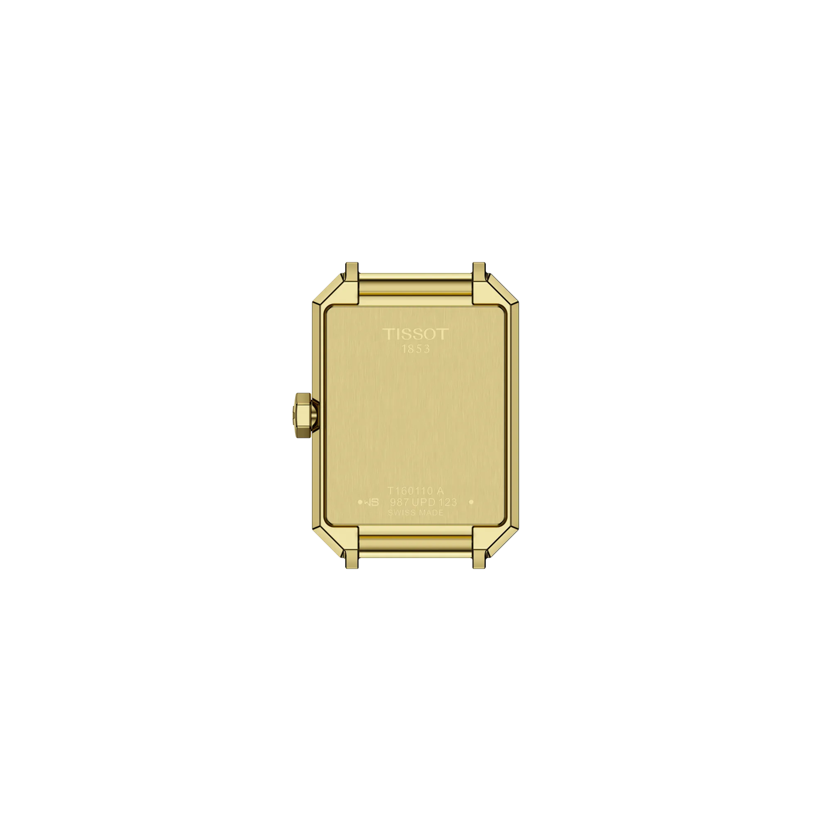 Een elegant goudkleurig dameshorloge met een rechthoekige kast, champagnekleurige wijzerplaat en nauwkeurig Zwitsers quartz-uurwerk.